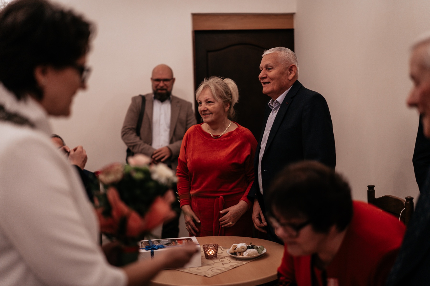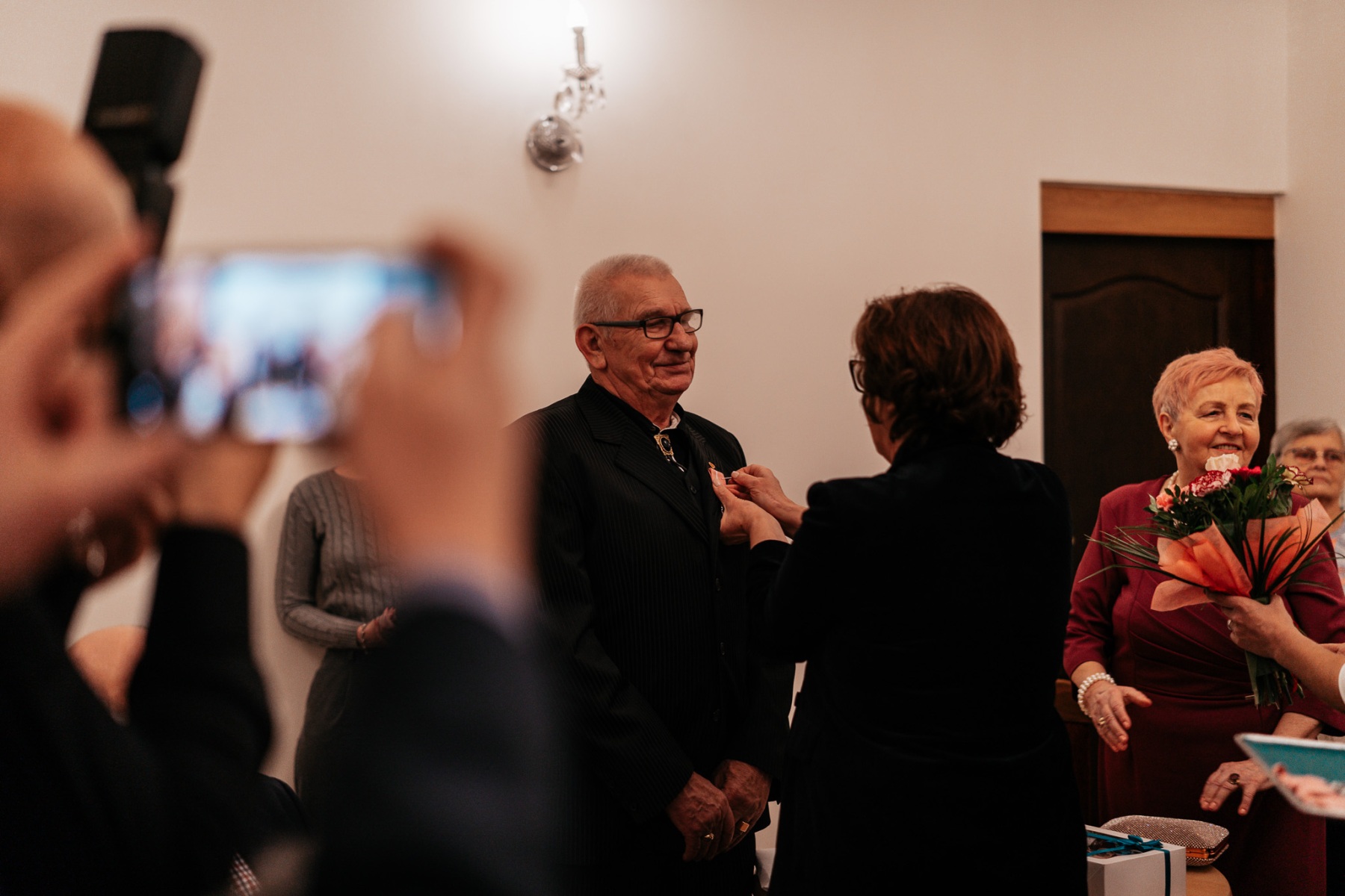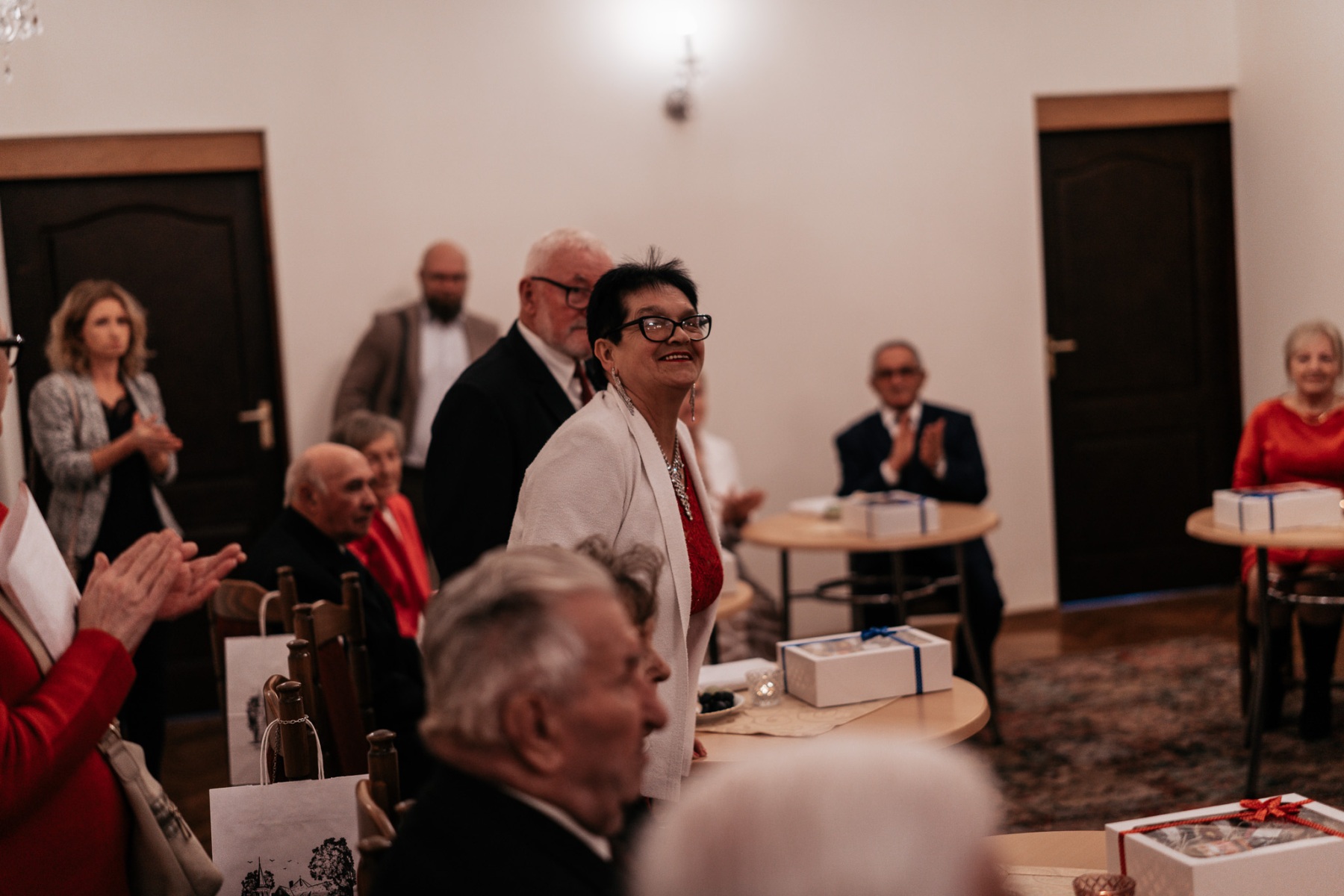 Uroczystość odbyła się w eleganckiej i ciepłej atmosferze, podczas której jubilaci nie kryli wzruszenia. Prezydent Zawiercia, Anna Nemś, w imieniu całego miasta, złożyła serdeczne gratulacje i życzenia zdrowia, pomyślności oraz kolejnych lat w szczęściu i miłości. Podkreśliła wyjątkowy wkład jubilatów w życie rodzinne oraz lokalnej społeczności, zaznaczając, że ich wytrwałość, wzajemne wsparcie i oddanie są prawdziwym przykładem dla młodszych pokoleń.